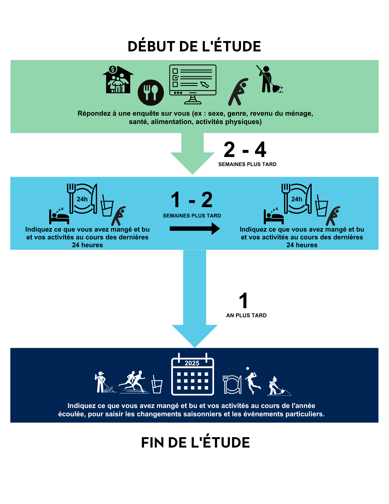 3. 11 mois plus tard, nous vous demanderons de remplir un questionnaire sur votre consommation d’aliments et votre activité physique au cours de l'année précédente. Ce rappel rétrospectif nous aidera à saisir les événements spéciaux et les changements saisonniers au niveau de votre alimentation et de la façon dont vous bougez.